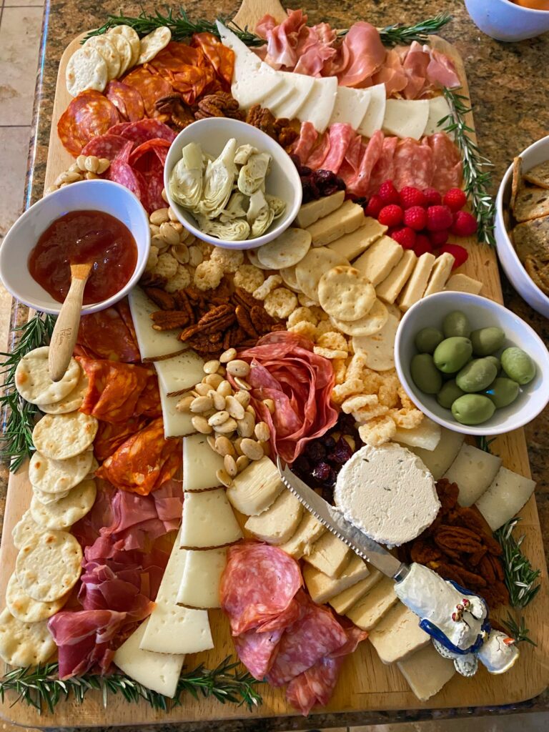 and for dinner, we had a giant charceuterie board, caviar + accompaniments, shrimp cocktail, and for dinner, beef tenderloin with horseradish mustard sauce, smoked turkey, maple brussels, and mashed sweet potatoes.