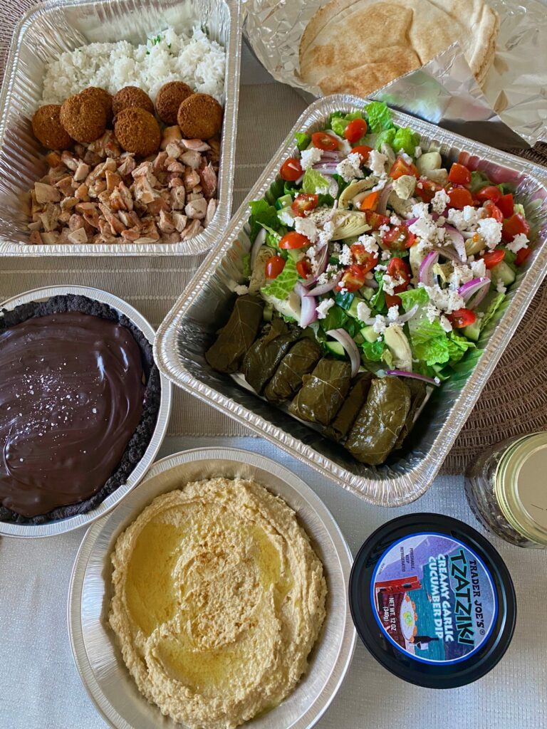 Made a baby meal this week! Even though the Pilot is retired, I’m still on the squadron email lists, so I’ll keep signing up for baby meals as long as they let me. 😉 This week, we brought rice (with mint and lemon zest), a salad with the best balsamic dressing, grape leaves, grilled chicken, homemade hummus, TJ’s tzakziki, falafel, pita, and a chocolate peanut butter tart. (<— I’ve also made this with coconut cream, kite hill cream cheese and GF Oreo’s and it.is.a.dream.)