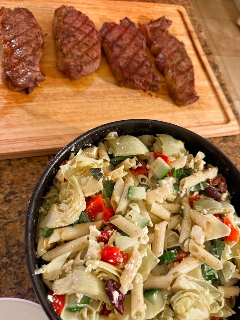 – Seasoned it with leftover pesto, olive oil, balsamic, salt, pepper, and oregano. I made a giant batch and we all snacked on it for a few days.