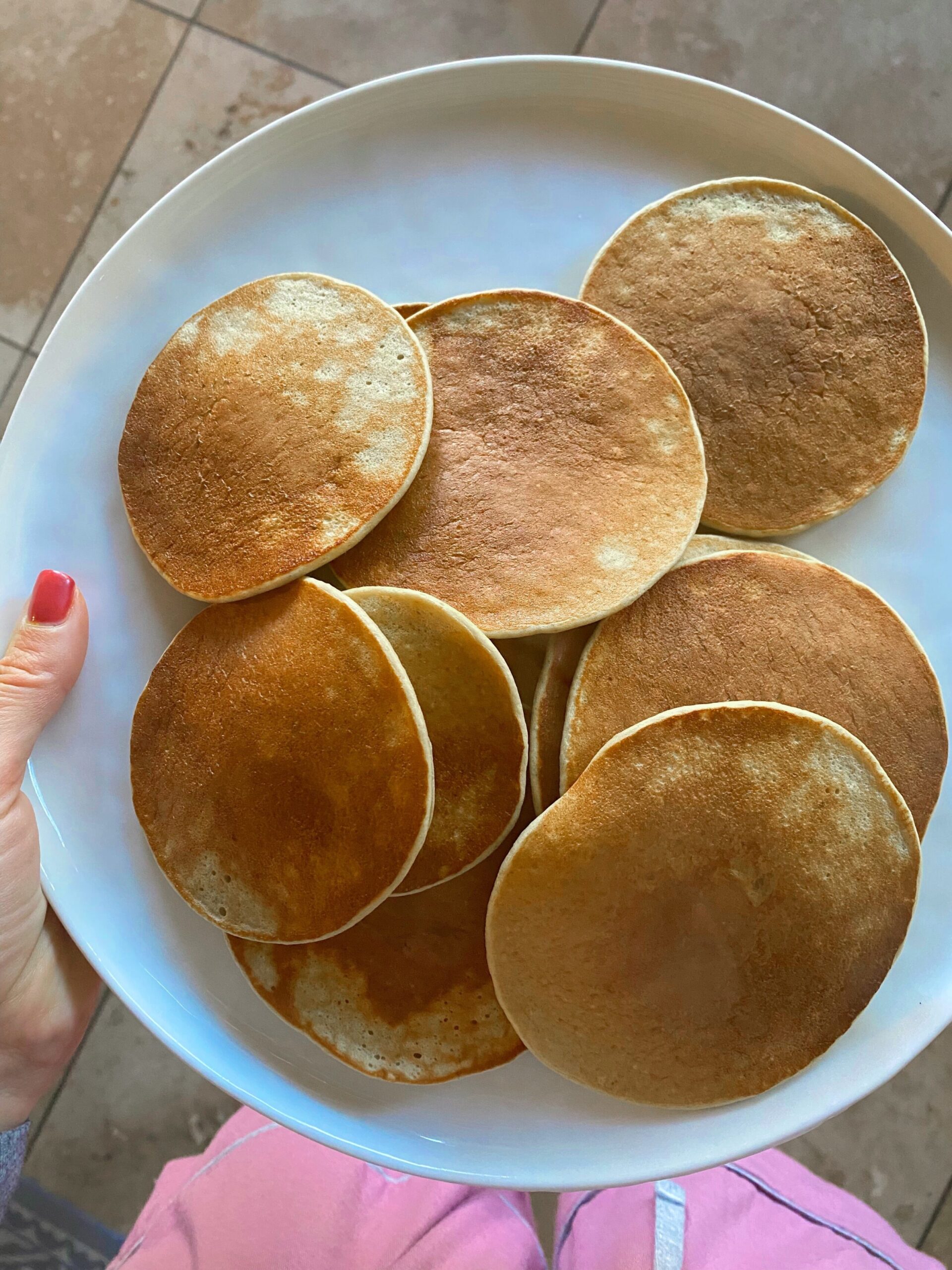 – *Their favorite pancakes in the world. I make huge batches of these over the weekend and freeze. I just heat them up, cut into bites, and put into a coffee mug to take in the car, and drizzle with maple syrup.