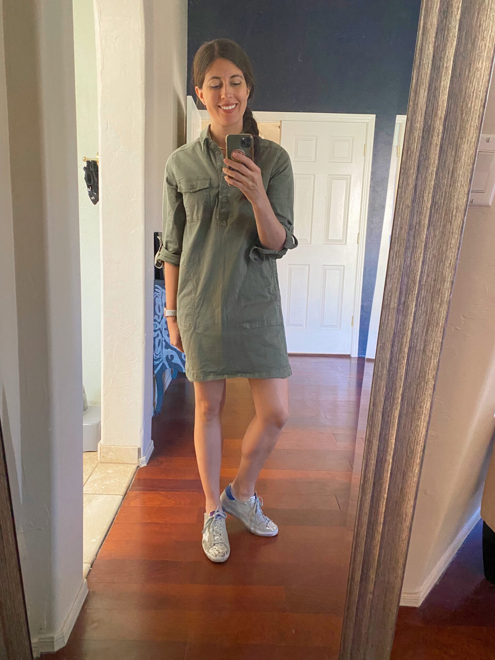 Shirtdresses are my go-to, especially because they’ve stood the test of time. I like wearing this one with Golden Goose sneakers and a high bun.